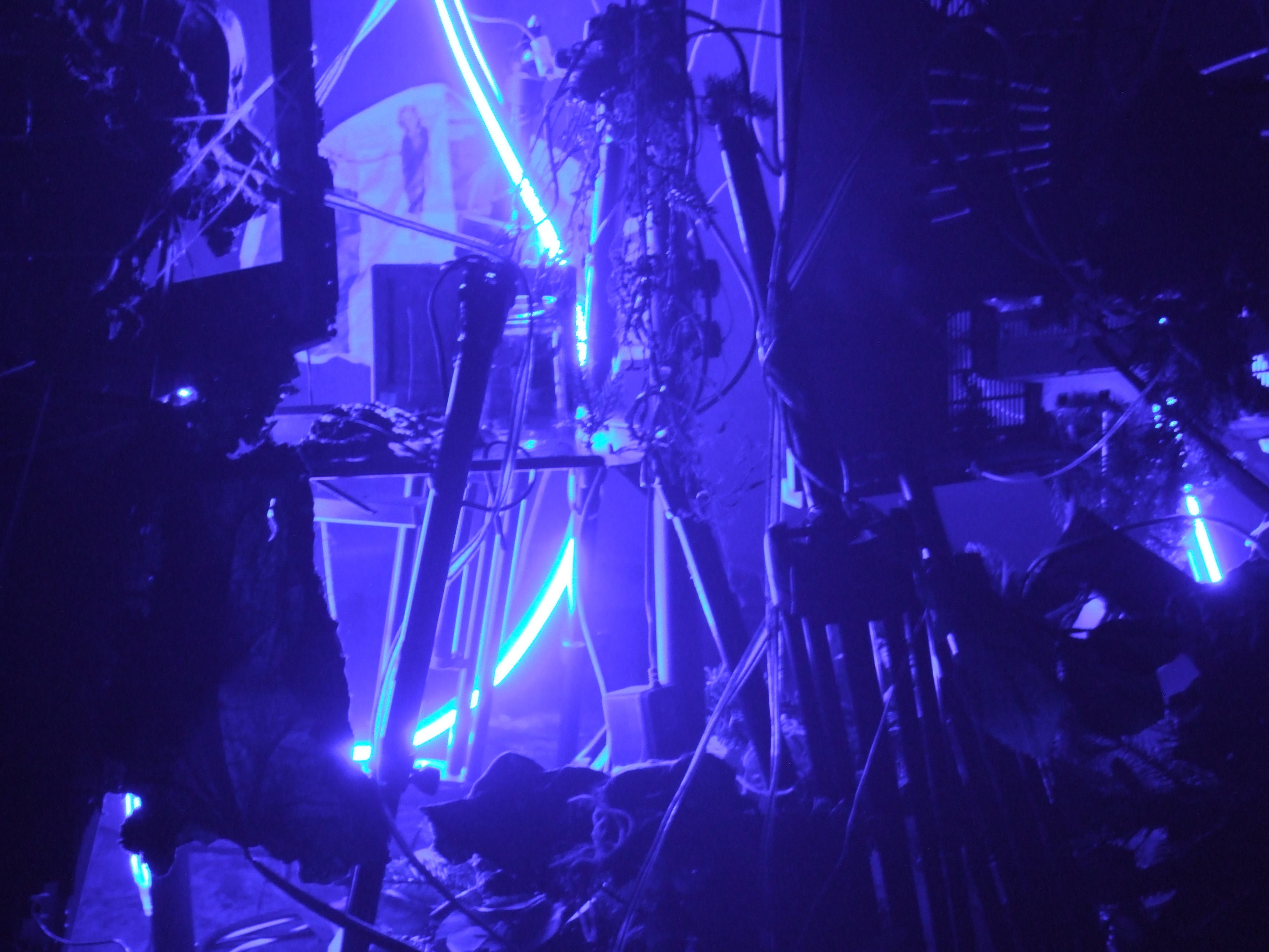 Material used: 3 screens/projector stands, 1 working BUSH TV monitor, 3 dismembered abandoned TV monitor, fake and real foliages, black foam boards, paper mache, acrylic varnish, wire, LED strip, huge ton of recycled electric wires from swap shop, recycle store and laundry wire, gigantic foliages from my home